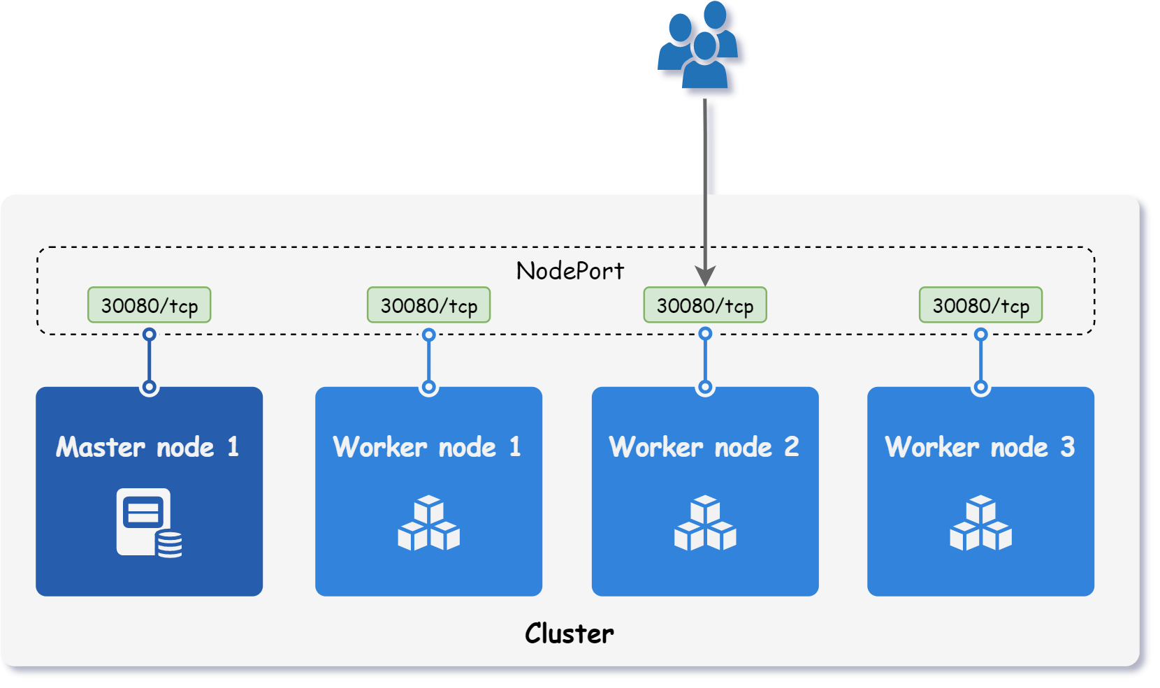 Setting Service type to NodePort makes Kubernetes reserve a port on all its nodes. As a result, the Service becomes available on <NodeIP>:<NodePort>, as shown in the figure below.